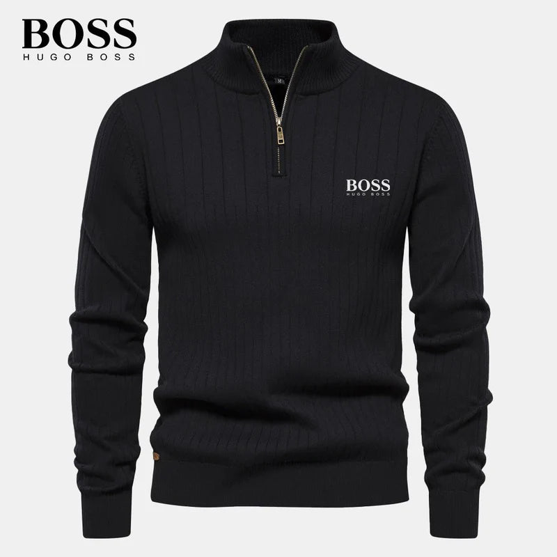 A modern essential built on precision and texture. This zip-neck sweater moves beyond the classic knit, offering a structured, architectural piece for the discerning wardrobe. Its defining feature is a prominent vertical rib-knit, which not only provides exceptional warmth and a comfortable stretch but also creates a clean, streamlined silhouette.
